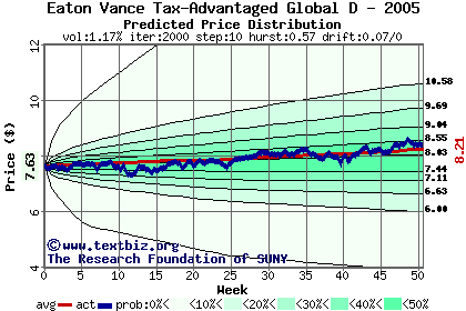 The high to date and low to date prices of the stock plotted against a random walk model for 2005 (what's this?).