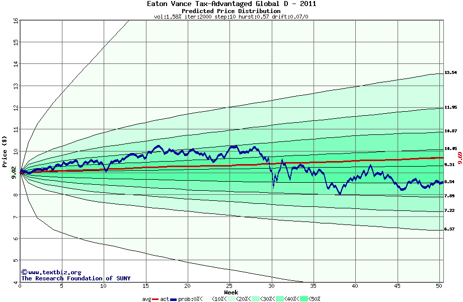 The high to date and low to date prices of the stock plotted against a random walk model for 2011 (what's this?).