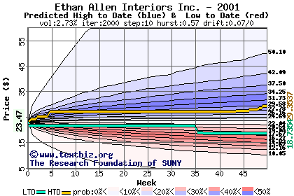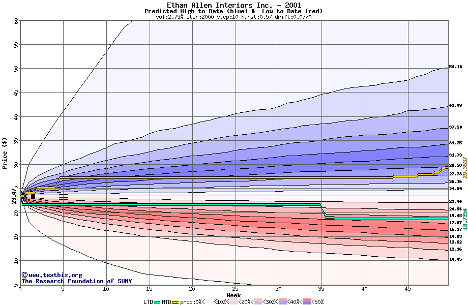 The high to date and low to date prices of the stock plotted against a random walk model for 2001 (what's this?).