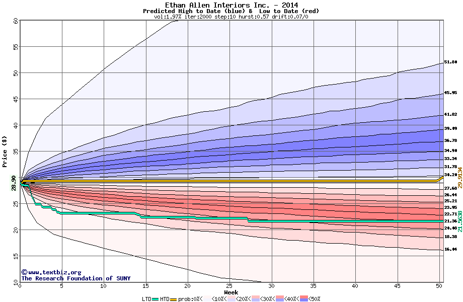 The high to date and low to date prices of the stock plotted against a random walk model for 2014 (what's this?).