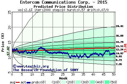 The high to date and low to date prices of the stock plotted against a random walk model for 2015 (what's this?).