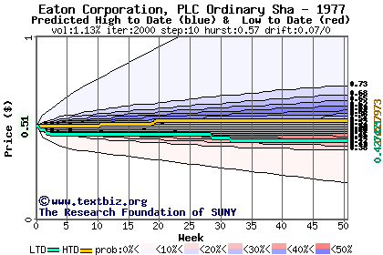 The high to date and low to date prices of the stock plotted against a random walk model for 1977 (what's this?).