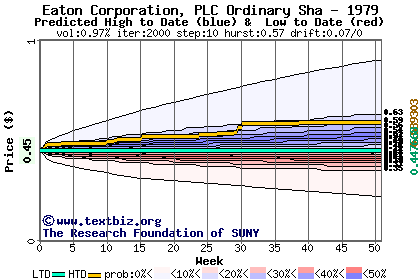 The high to date and low to date prices of the stock plotted against a random walk model for 1979 (what's this?).