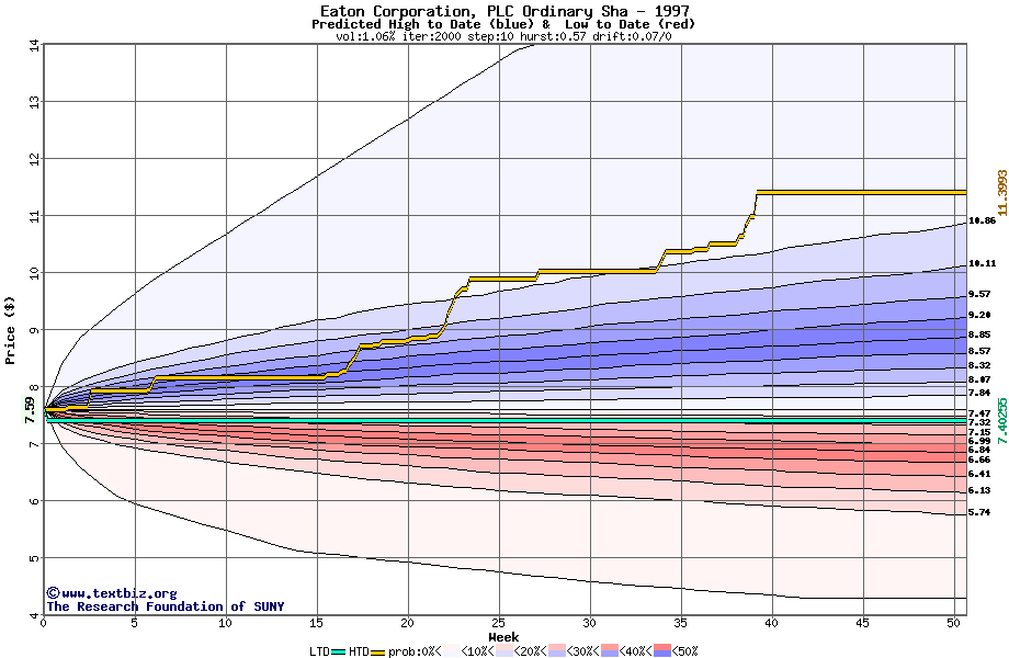 The high to date and low to date prices of the stock plotted against a random walk model for 1997 (what's this?).