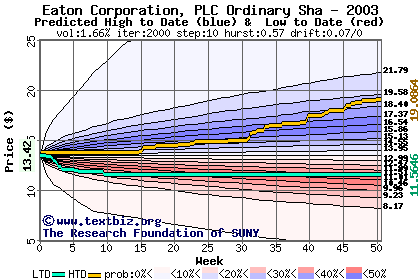 The high to date and low to date prices of the stock plotted against a random walk model for 2003 (what's this?).