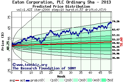The high to date and low to date prices of the stock plotted against a random walk model for 2013 (what's this?).