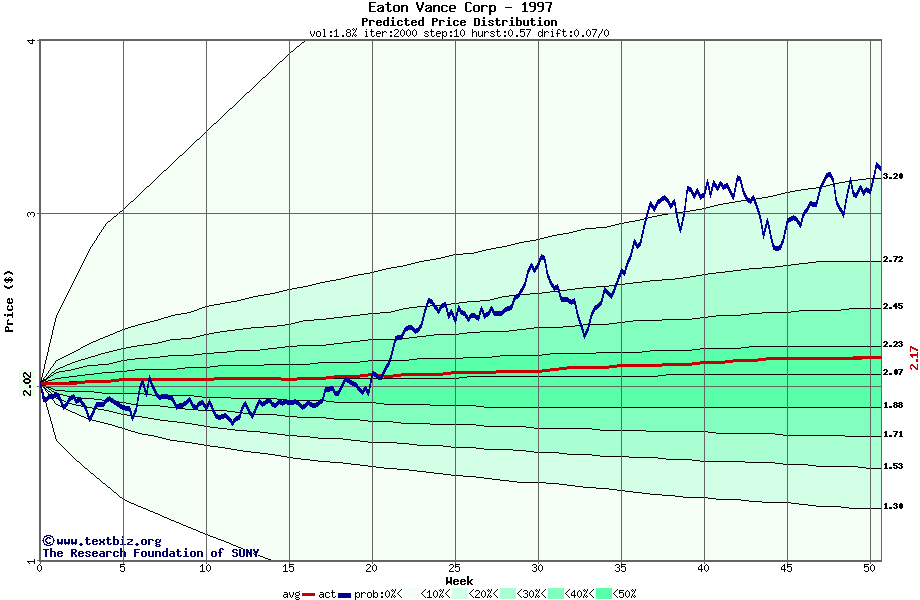The following graph plots the year-to-date performance of the stock for 1997 compared to the probability calculated by a random walk model.