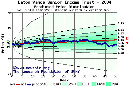 The high to date and low to date prices of the stock plotted against a random walk model for 2004 (what's this?).