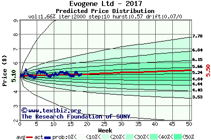 The high to date and low to date prices of the stock plotted against a random walk model for 2017 (what's this?).