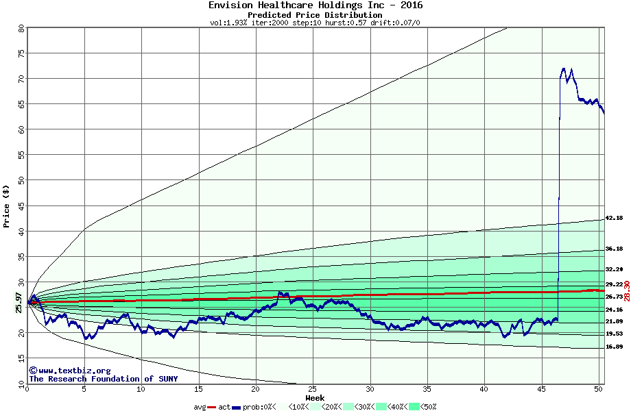The following graph plots the year-to-date performance of the stock for 2016 compared to the probability calculated by a random walk model.