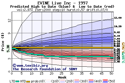 The high to date and low to date prices of the stock plotted against a random walk model for 1997 (what's this?).