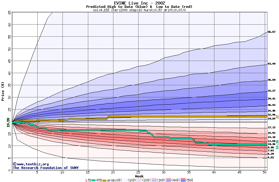The high to date and low to date prices of the stock plotted against a random walk model for 2002 (what's this?).