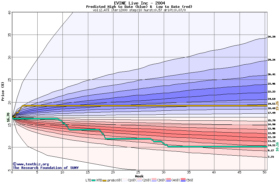 The high to date and low to date prices of the stock plotted against a random walk model for 2004 (what's this?).