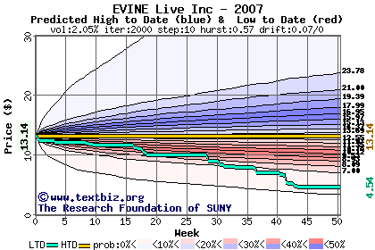 The high to date and low to date prices of the stock plotted against a random walk model for 2007 (what's this?).