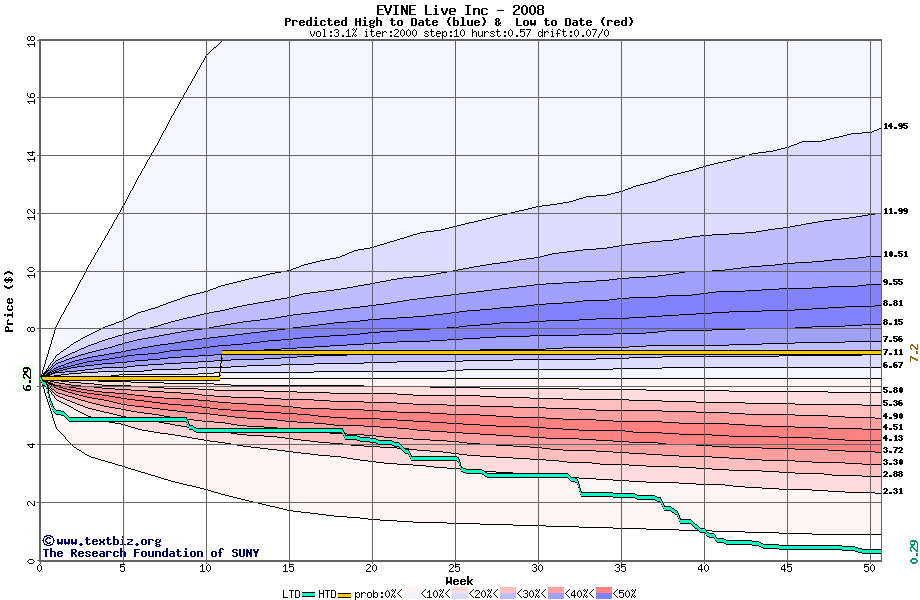 The high to date and low to date prices of the stock plotted against a random walk model for 2008 (what's this?).