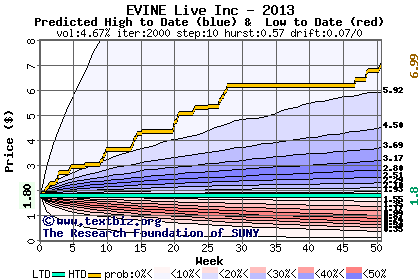 The high to date and low to date prices of the stock plotted against a random walk model for 2013 (what's this?).