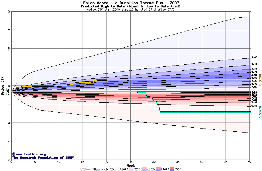 The high to date and low to date prices of the stock plotted against a random walk model for 2007 (what's this?).
