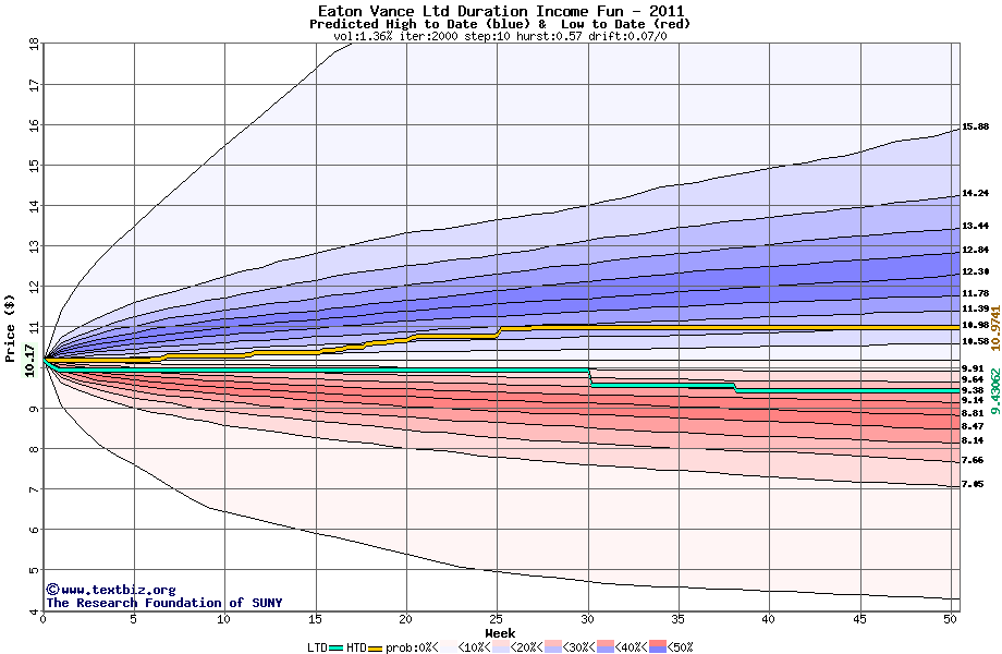 The high to date and low to date prices of the stock plotted against a random walk model for 2011 (what's this?).