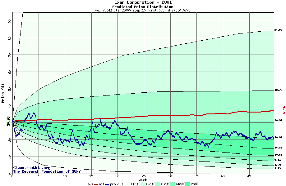 The following graph plots the year-to-date performance of the stock for 2001 compared to the probability calculated by a random walk model.