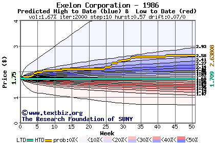 The high to date and low to date prices of the stock plotted against a random walk model for 1986 (what's this?).