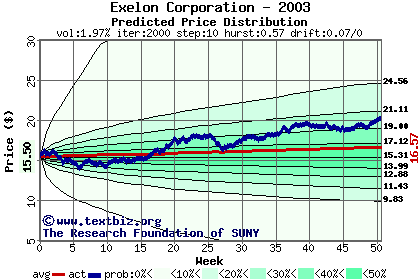 The high to date and low to date prices of the stock plotted against a random walk model for 2003 (what's this?).