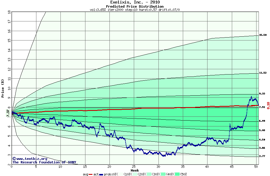 The following graph plots the year-to-date performance of the stock for 2010 compared to the probability calculated by a random walk model.