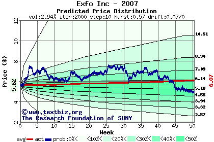 The high to date and low to date prices of the stock plotted against a random walk model for 2007 (what's this?).