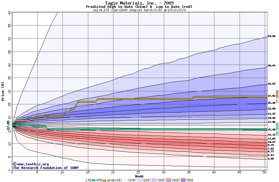 The high to date and low to date prices of the stock plotted against a random walk model for 2009 (what's this?).