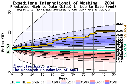 The high to date and low to date prices of the stock plotted against a random walk model for 2004 (what's this?).