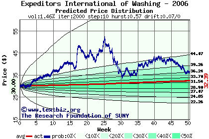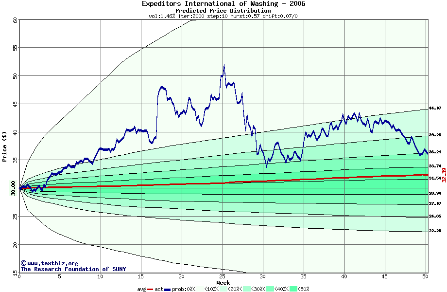 The following graph plots the year-to-date performance of the stock for 2006 compared to the probability calculated by a random walk model.