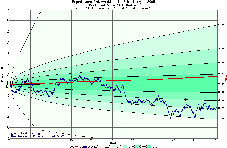 The following graph plots the year-to-date performance of the stock for 2008 compared to the probability calculated by a random walk model.