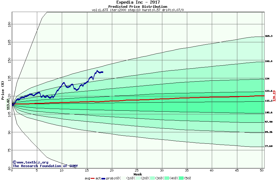 The following graph plots the year-to-date performance of the stock for 2017 compared to the probability calculated by a random walk model.