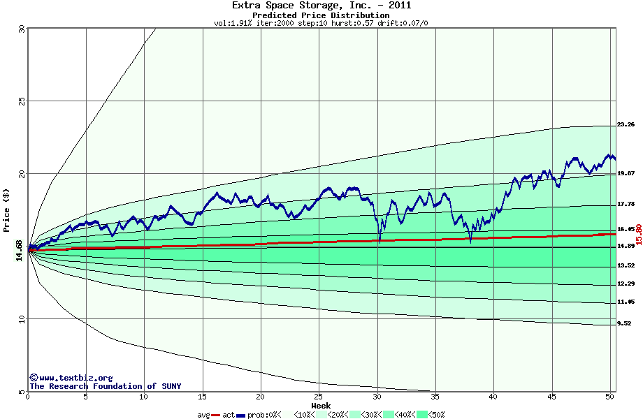 The high to date and low to date prices of the stock plotted against a random walk model for 2011 (what's this?).