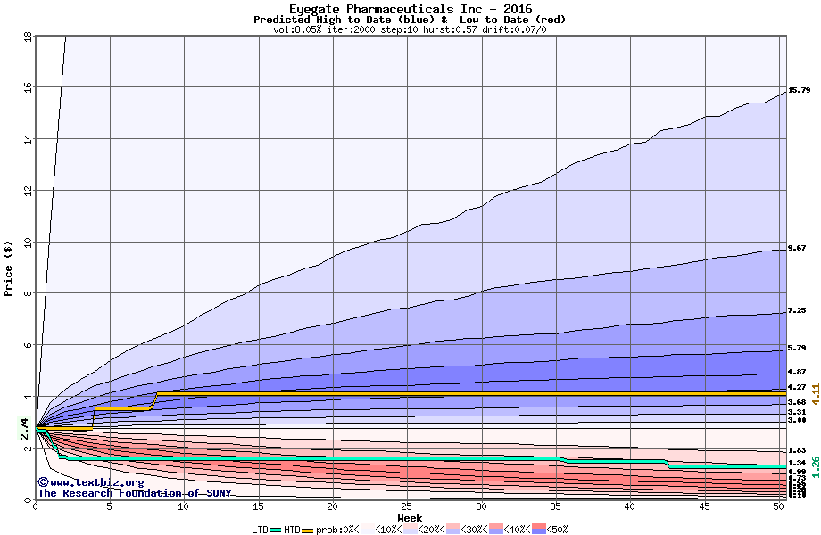 The high to date and low to date prices of the stock plotted against a random walk model for 2016 (what's this?).