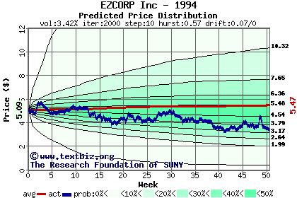 The high to date and low to date prices of the stock plotted against a random walk model for 1994 (what's this?).