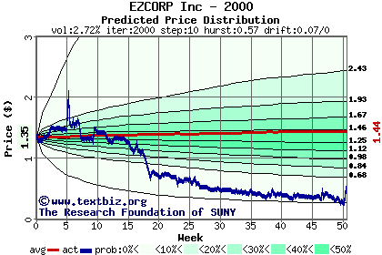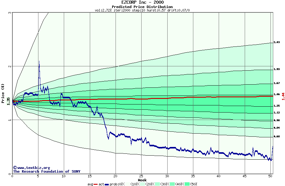 The high to date and low to date prices of the stock plotted against a random walk model for 2000 (what's this?).