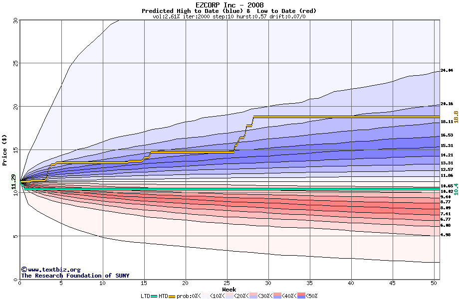 The high to date and low to date prices of the stock plotted against a random walk model for 2008 (what's this?).