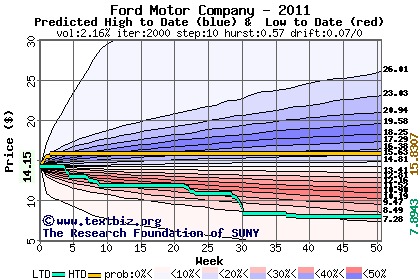The high to date and low to date prices of the stock plotted against a random walk model for 2011 (what's this?).