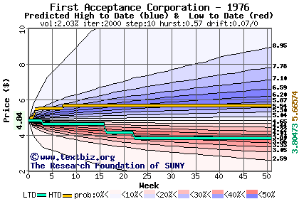 The high to date and low to date prices of the stock plotted against a random walk model for 1976 (what's this?).
