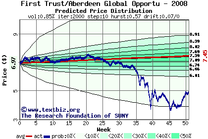 The high to date and low to date prices of the stock plotted against a random walk model for 2008 (what's this?).