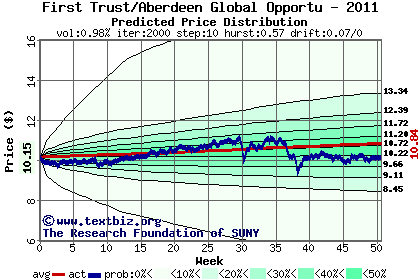 The high to date and low to date prices of the stock plotted against a random walk model for 2011 (what's this?).