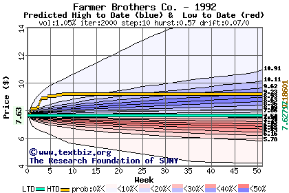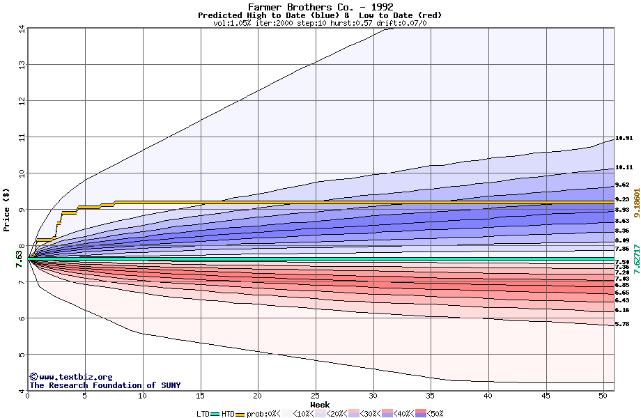 The high to date and low to date prices of the stock plotted against a random walk model for 1992 (what's this?).