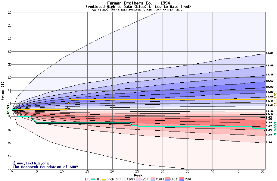 The high to date and low to date prices of the stock plotted against a random walk model for 1994 (what's this?).
