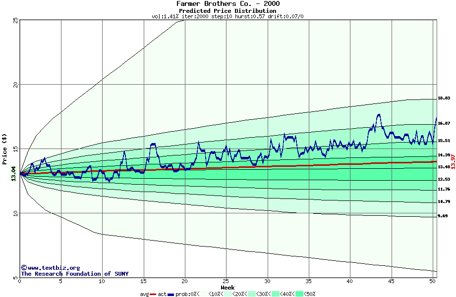 The following graph plots the year-to-date performance of the stock for 2000 compared to the probability calculated by a random walk model.