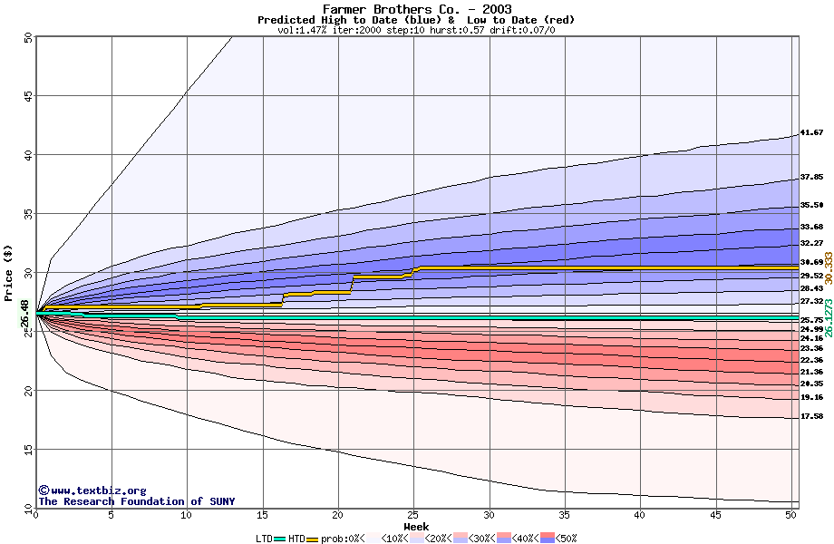 The high to date and low to date prices of the stock plotted against a random walk model for 2003 (what's this?).