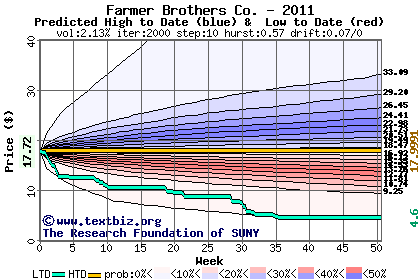 The high to date and low to date prices of the stock plotted against a random walk model for 2011 (what's this?).