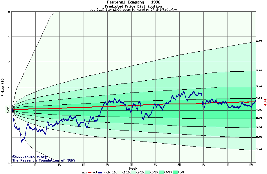 The following graph plots the year-to-date performance of the stock for 1996 compared to the probability calculated by a random walk model.