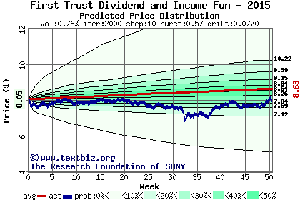 The high to date and low to date prices of the stock plotted against a random walk model for 2015 (what's this?).