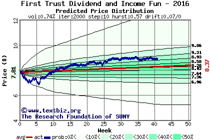 The high to date and low to date prices of the stock plotted against a random walk model for 2016 (what's this?).