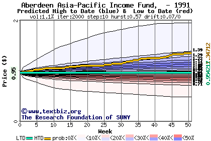 The high to date and low to date prices of the stock plotted against a random walk model for 1991 (what's this?).